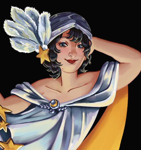 Character Design options of "Trixie StarChild", one of the characters featured in "Bootlegger's Paradox". She is a 1920's flapper girl with space and star design elements.